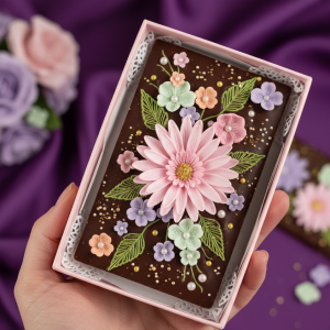 Designer box filled with floral-styled chocolate pieces elegant presentation with a couture feel.