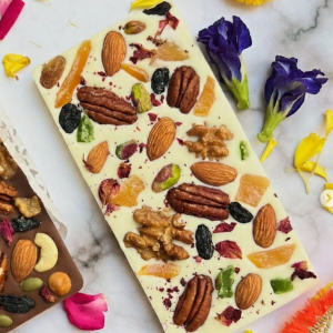 White/milk chocolate slab studded with mixed nuts and accented with edible flowers crunchy, colorful, premium.
